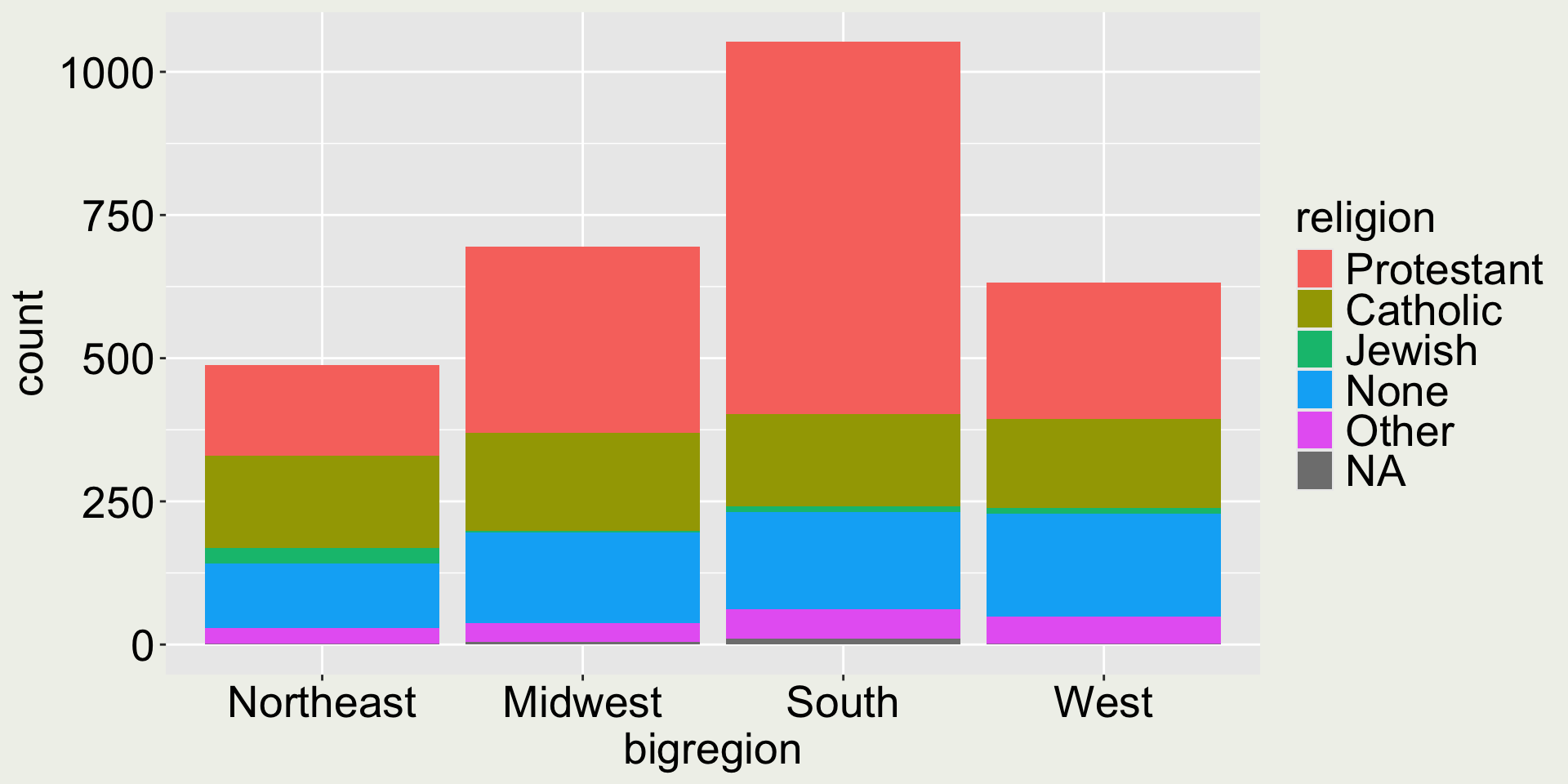 gss_sm |>ggplot(aes(x = bigregion, fill = religion)) +geom_bar()