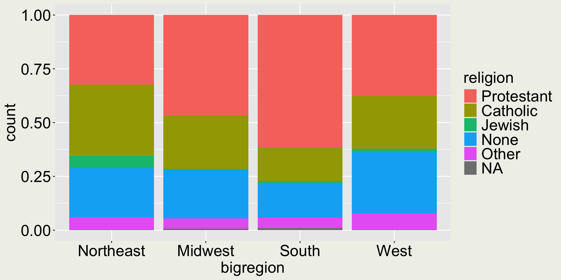 gss_sm |>ggplot(aes(x = bigregion, fill = religion)) +geom_bar(position ="fill")