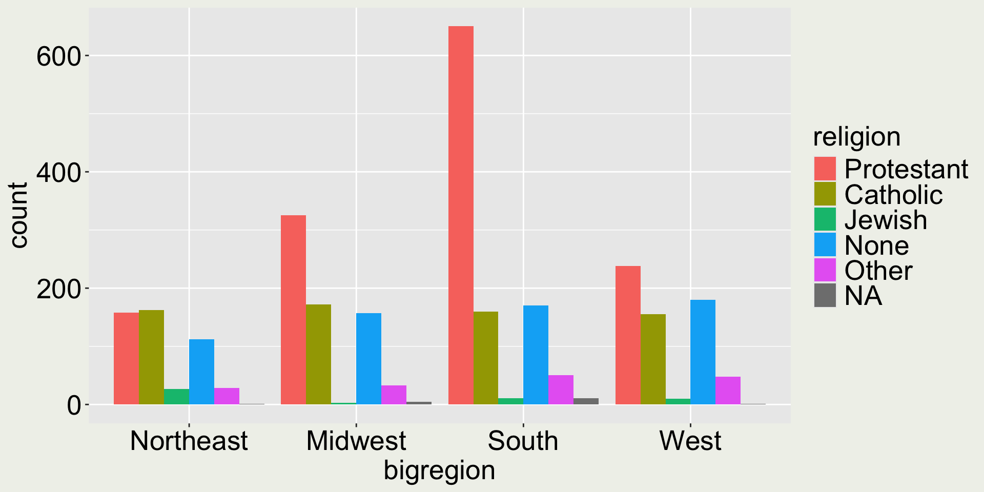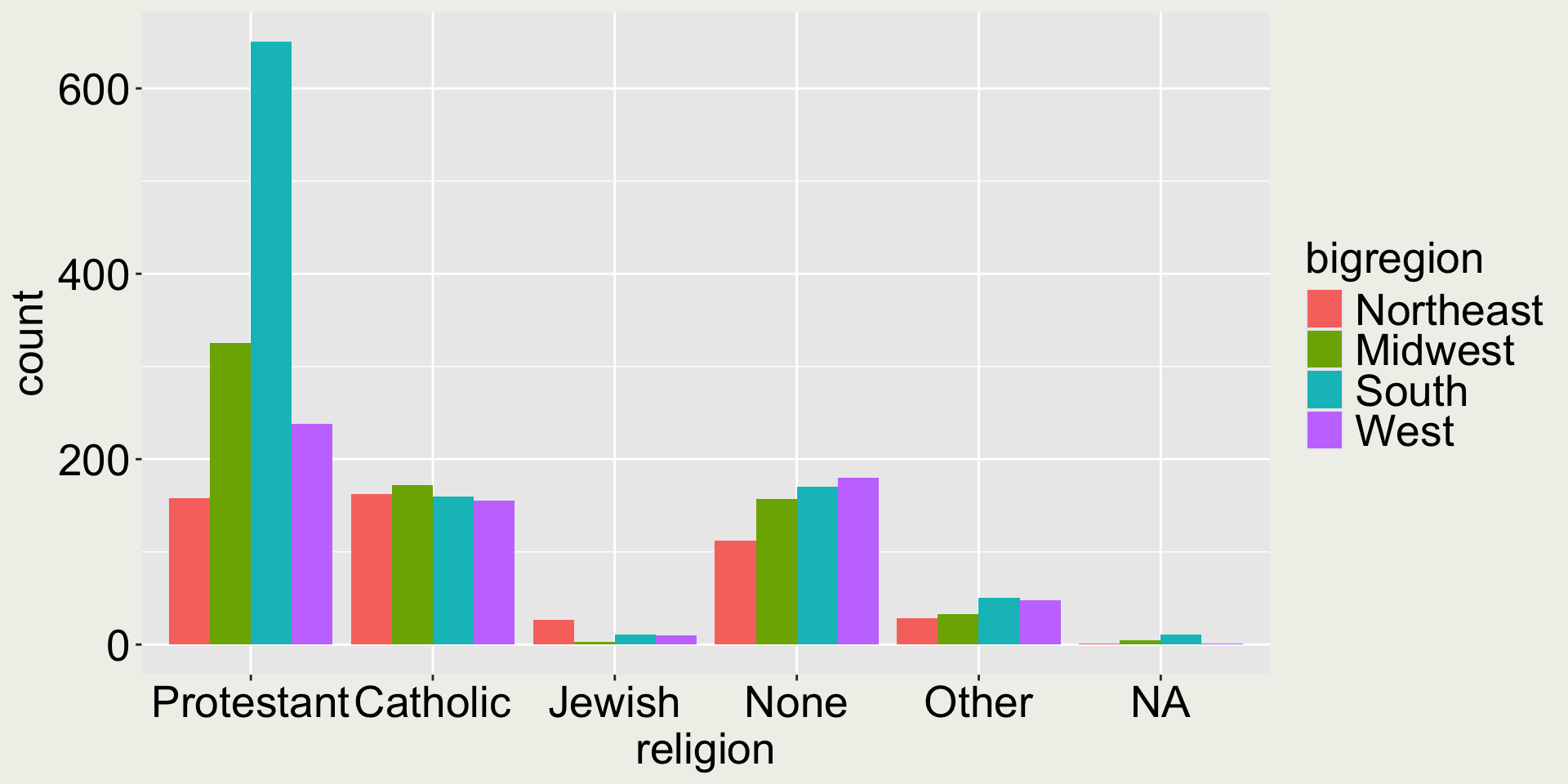 gss_sm |>ggplot(aes(x = religion, fill = bigregion)) +geom_bar(position ="dodge")