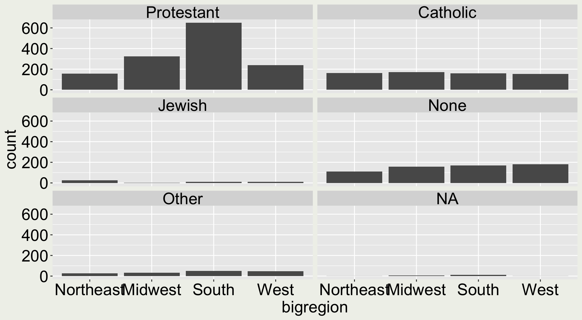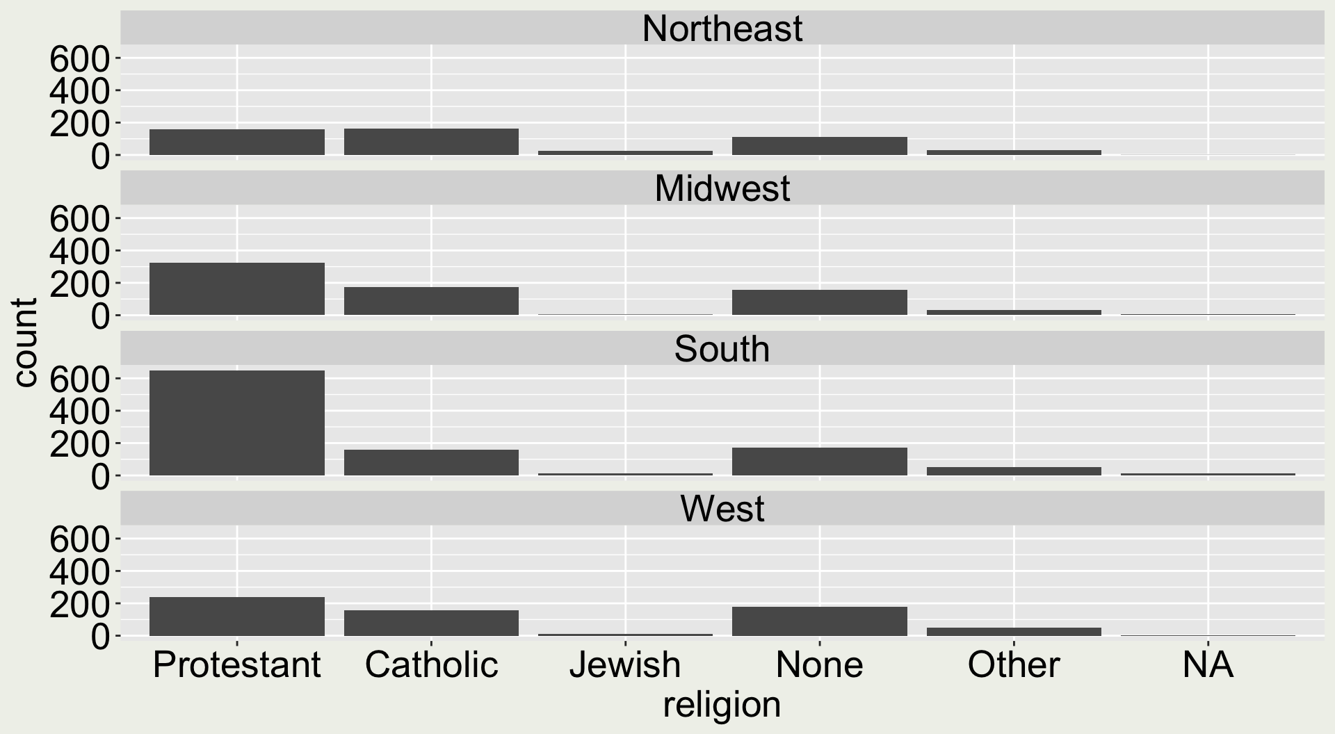 In this plot, it is easy to compare for each (big)region, the count of each religion category.