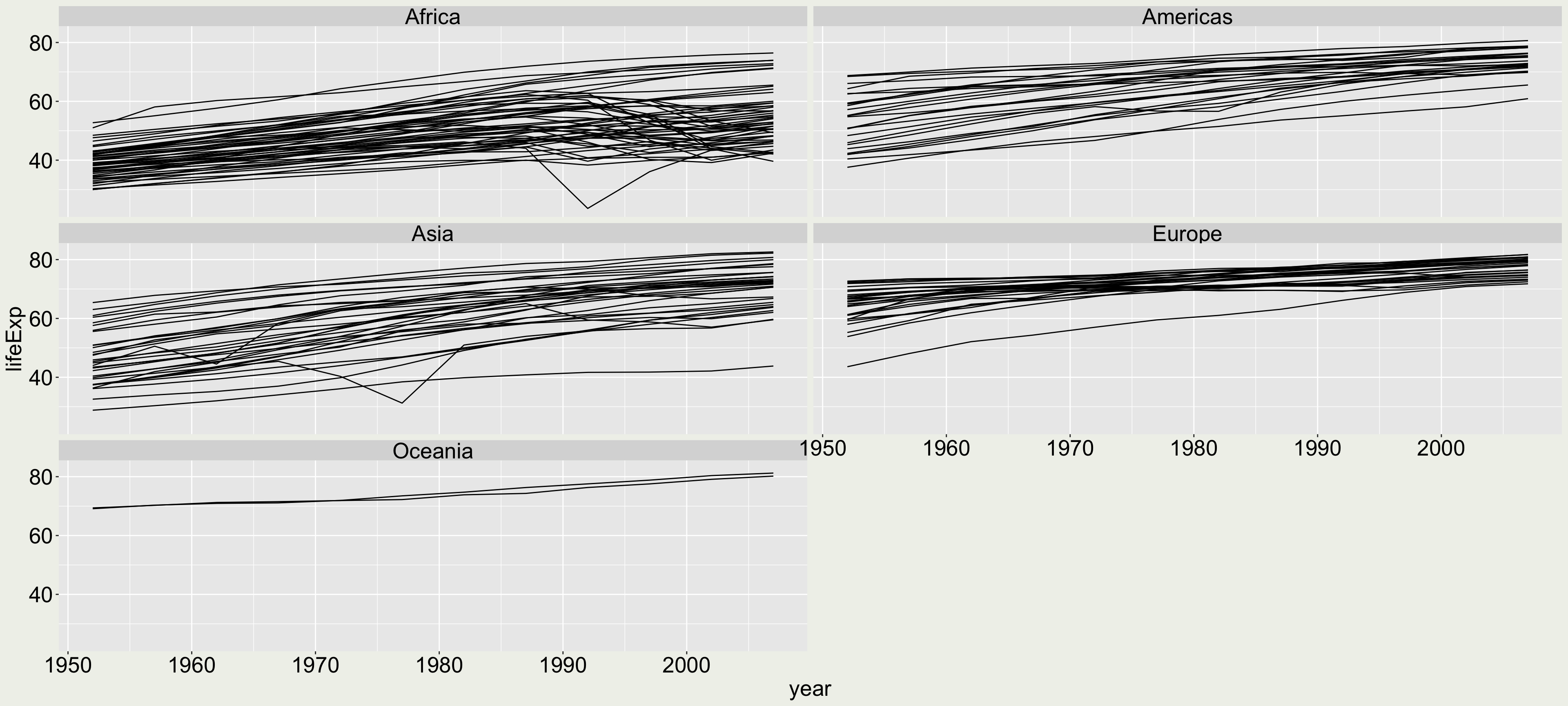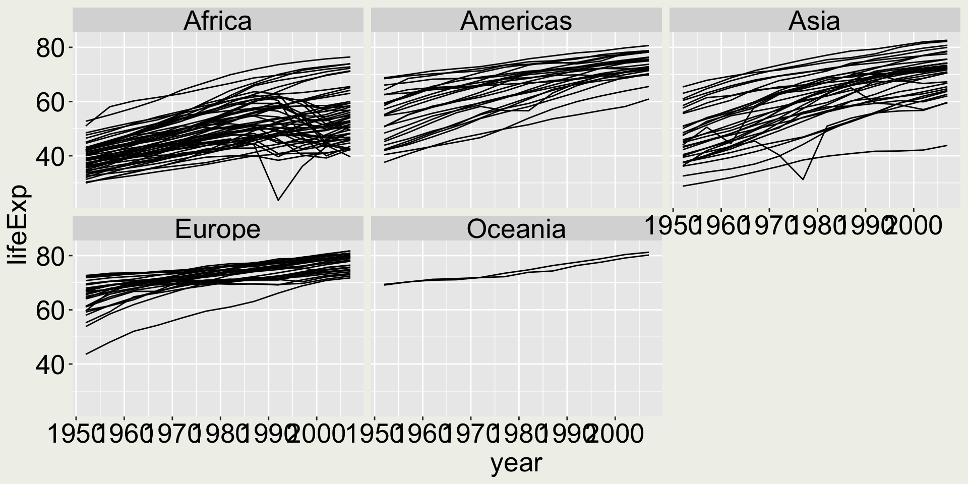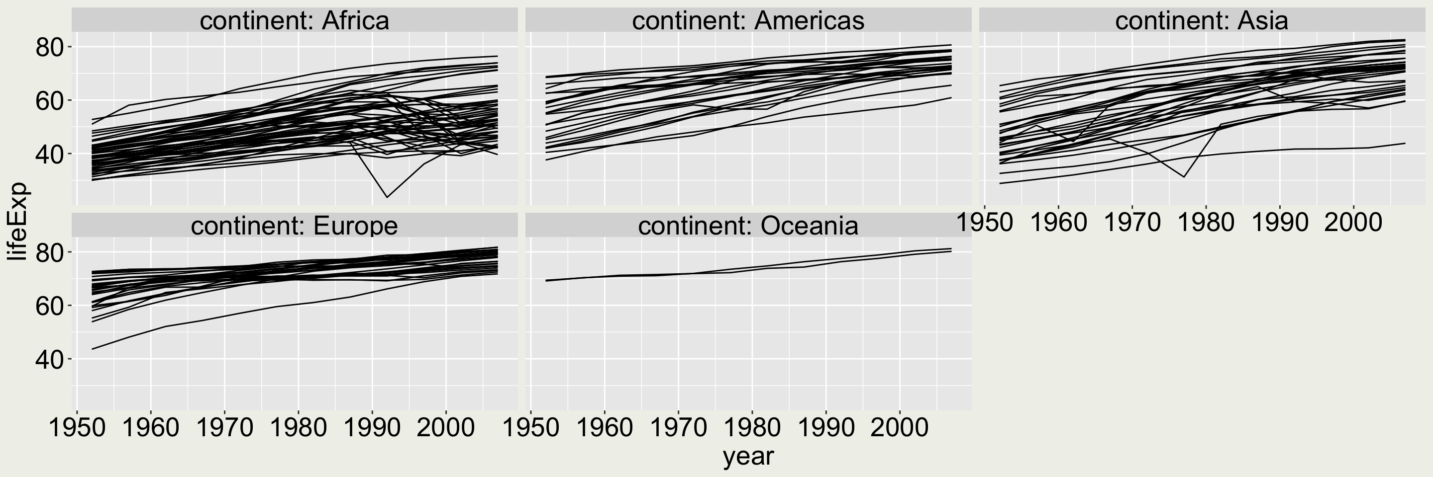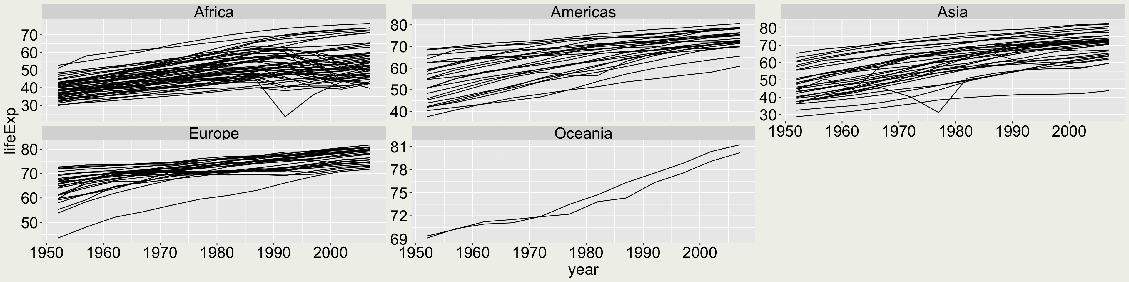 gapminder |>ggplot(aes(x = year, y = lifeExp, group = country)) +geom_line() +facet_wrap(vars(continent), labeller ="label_both")