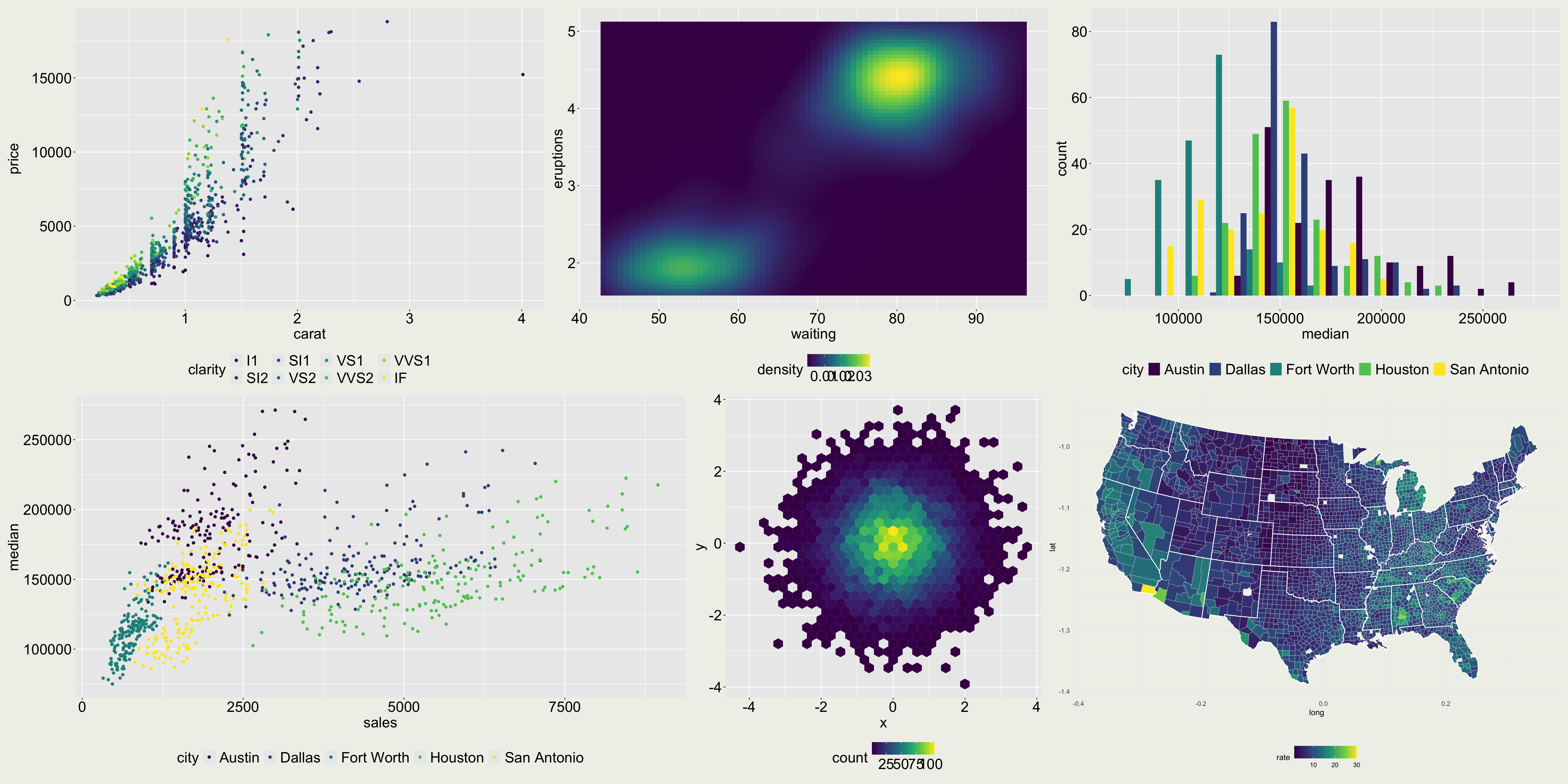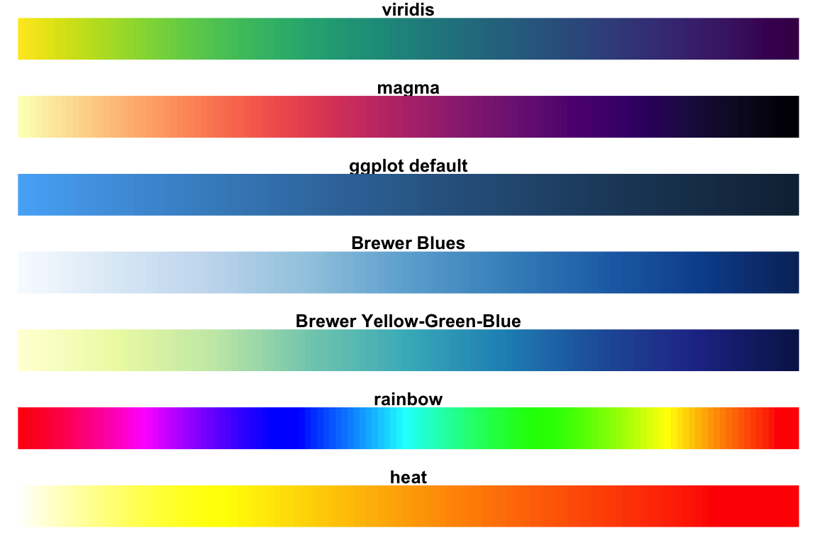 Color: The color seems to be mapped to a continuous value. Is it the best choice? How would you change it? What’s the scale_xxx_xxx() function to change to a different color palette.