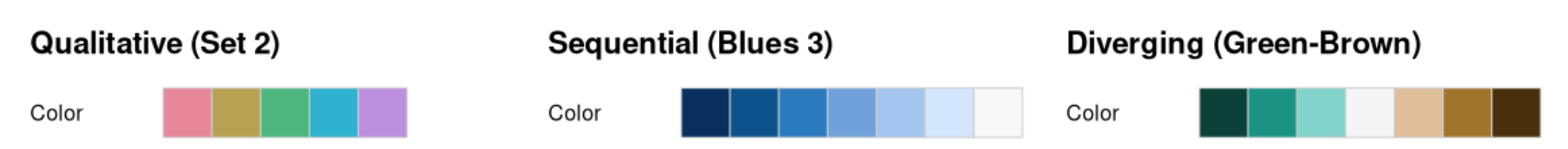 Qualitative: for categorical information, i.e., where no particular ordering of categories is available and every color should receive the same perceptual weight.