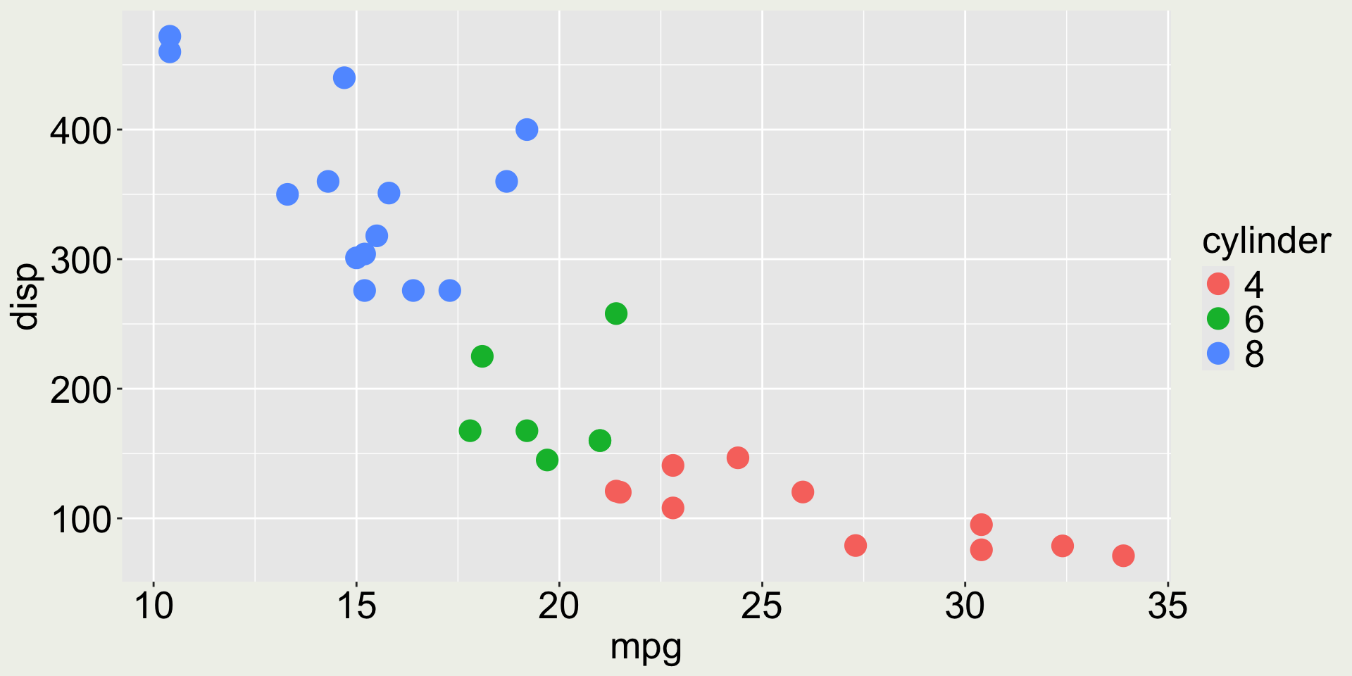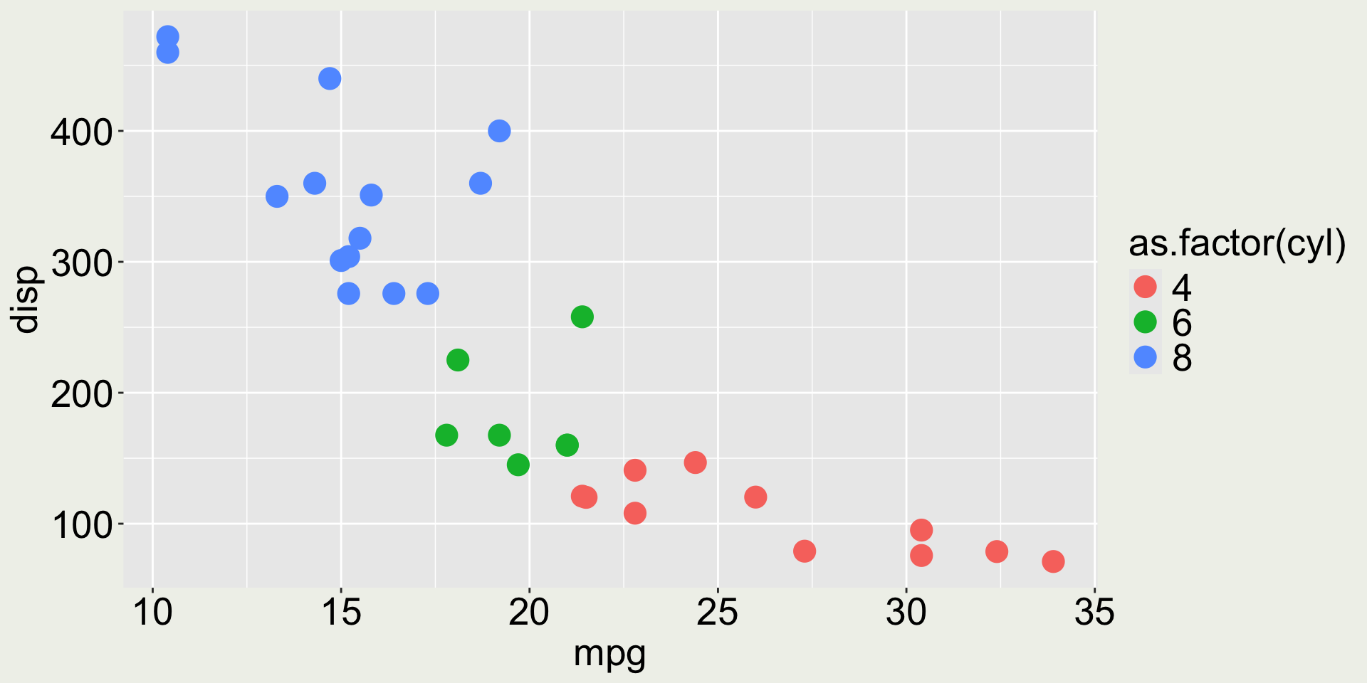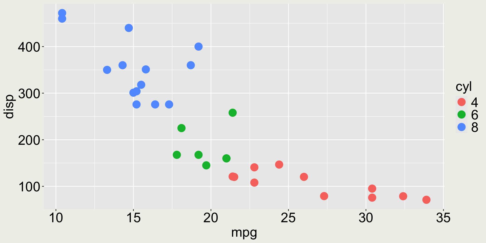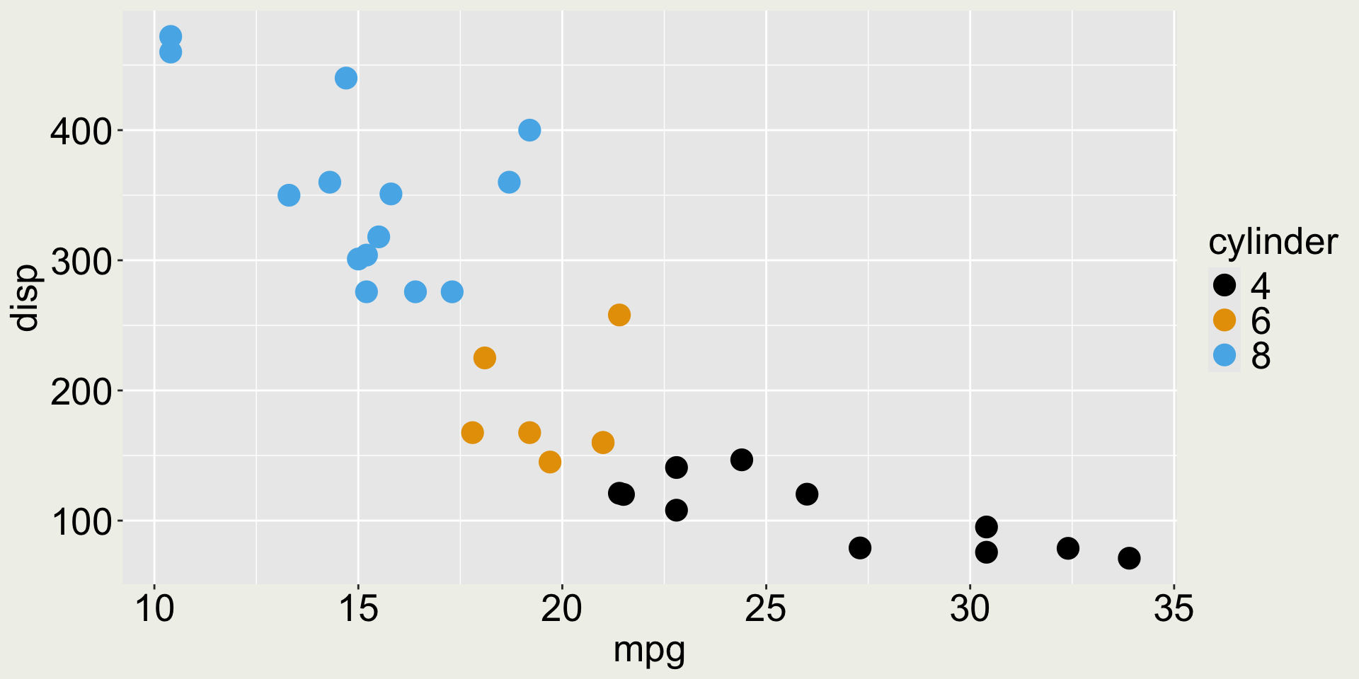 3 Datsun 710    22.8     4   108    93  3.85  2.32  18.6     1     1     4     1mtcars: mpg vs. disp colored by cyl