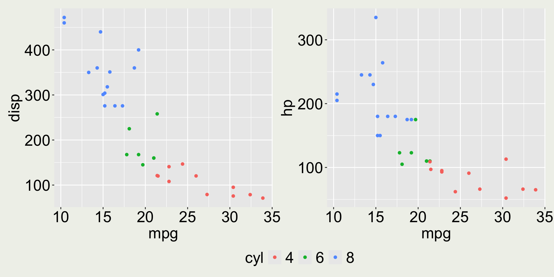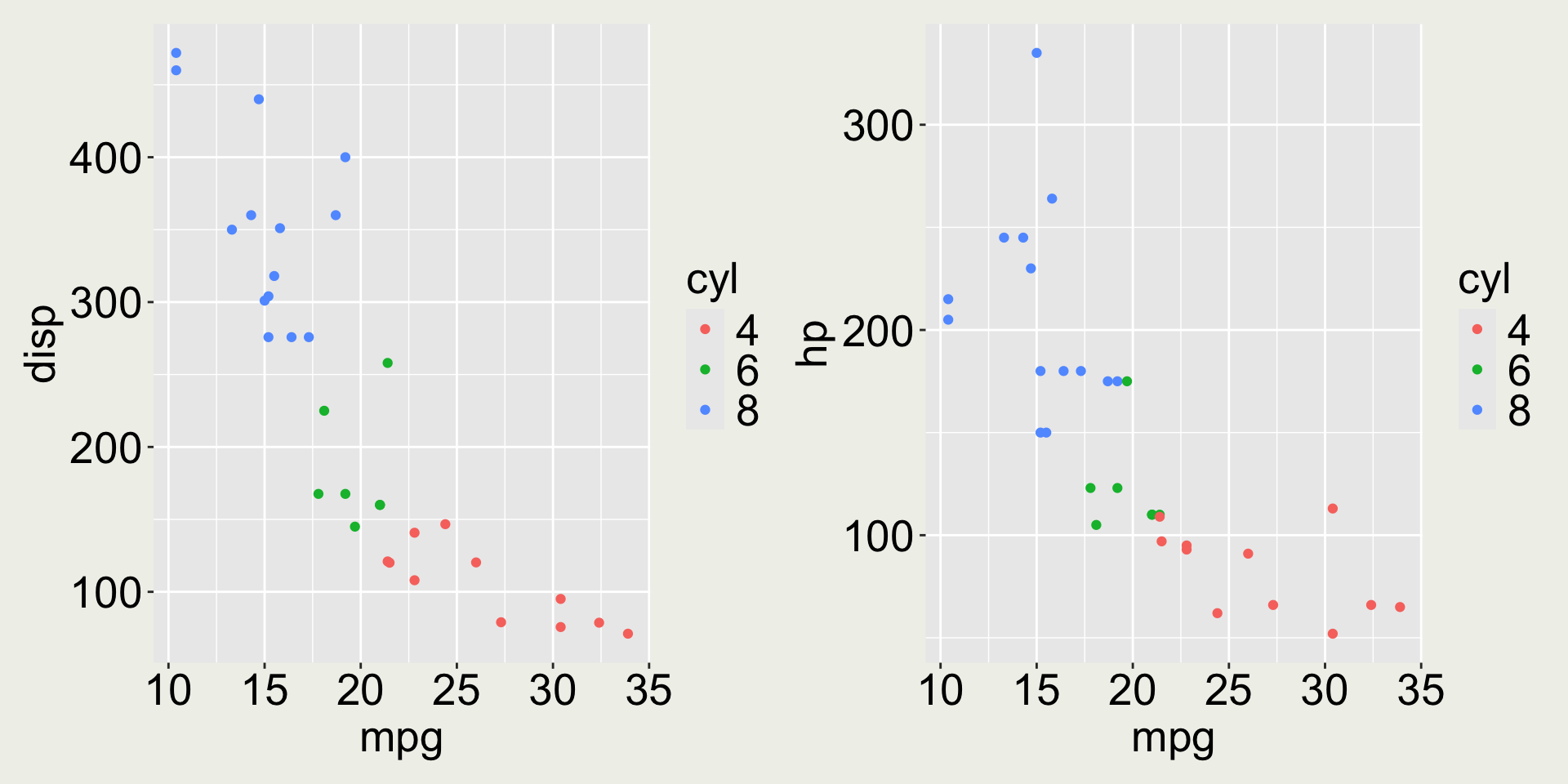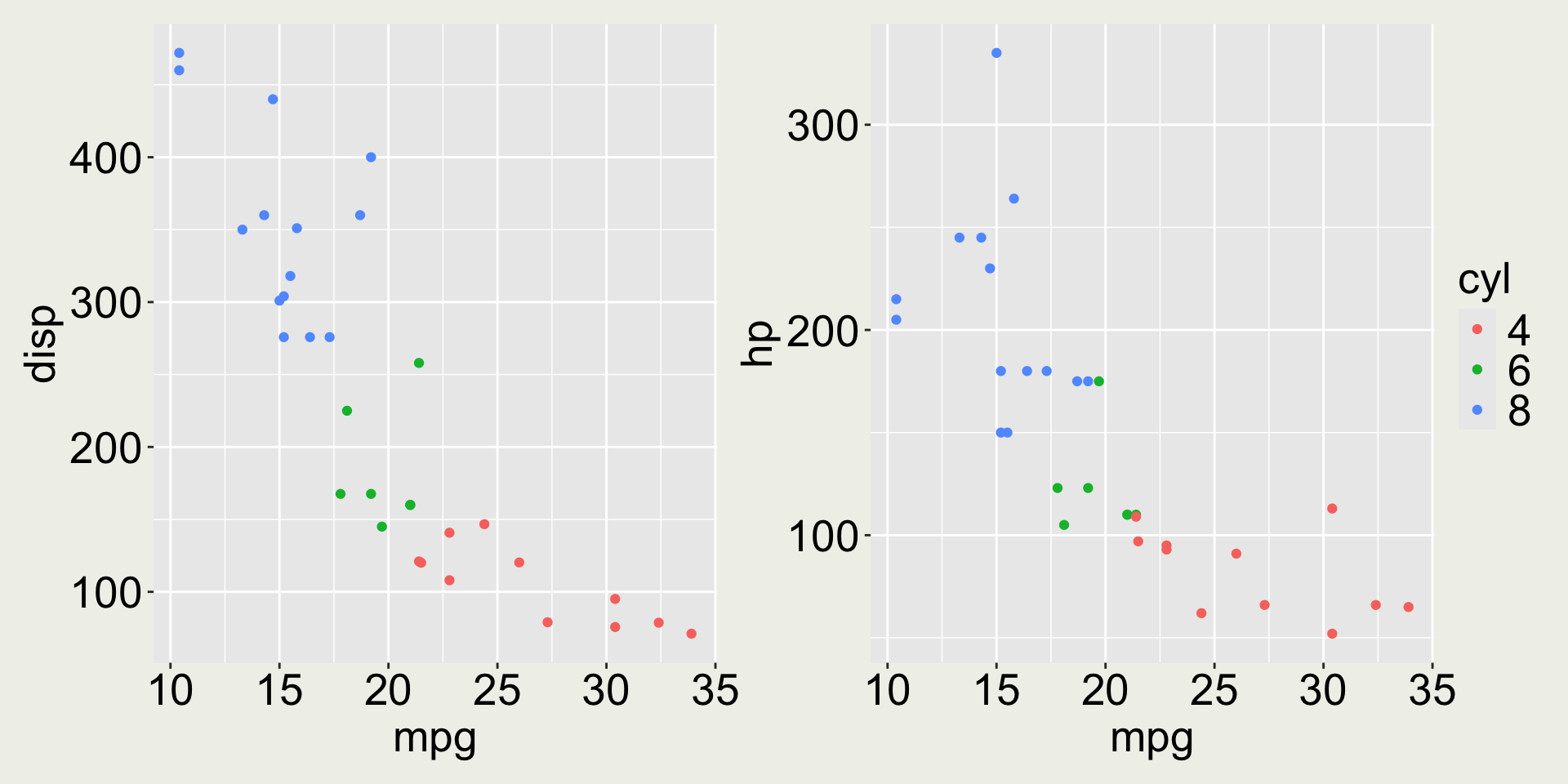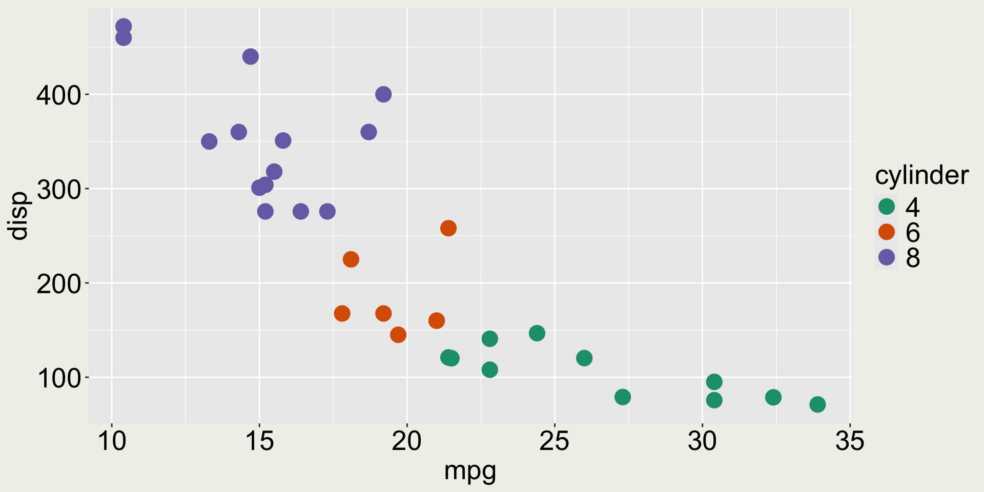 3 Datsun 710    22.8     4   108    93  3.85  2.32  18.6     1     1     4     1mtcars: mpg vs. disp colored by cyl