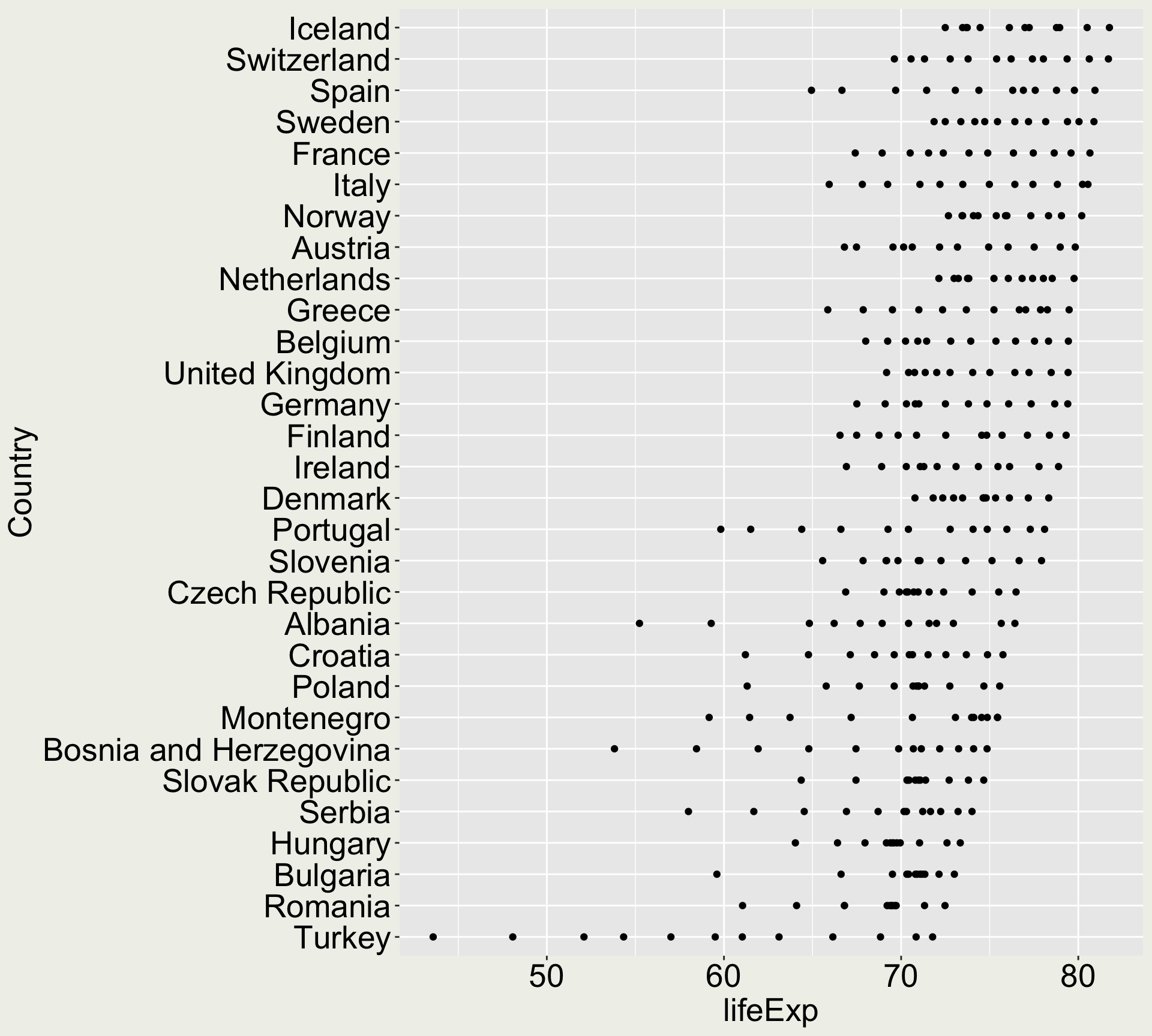 We order the country by the maximum life expectancy