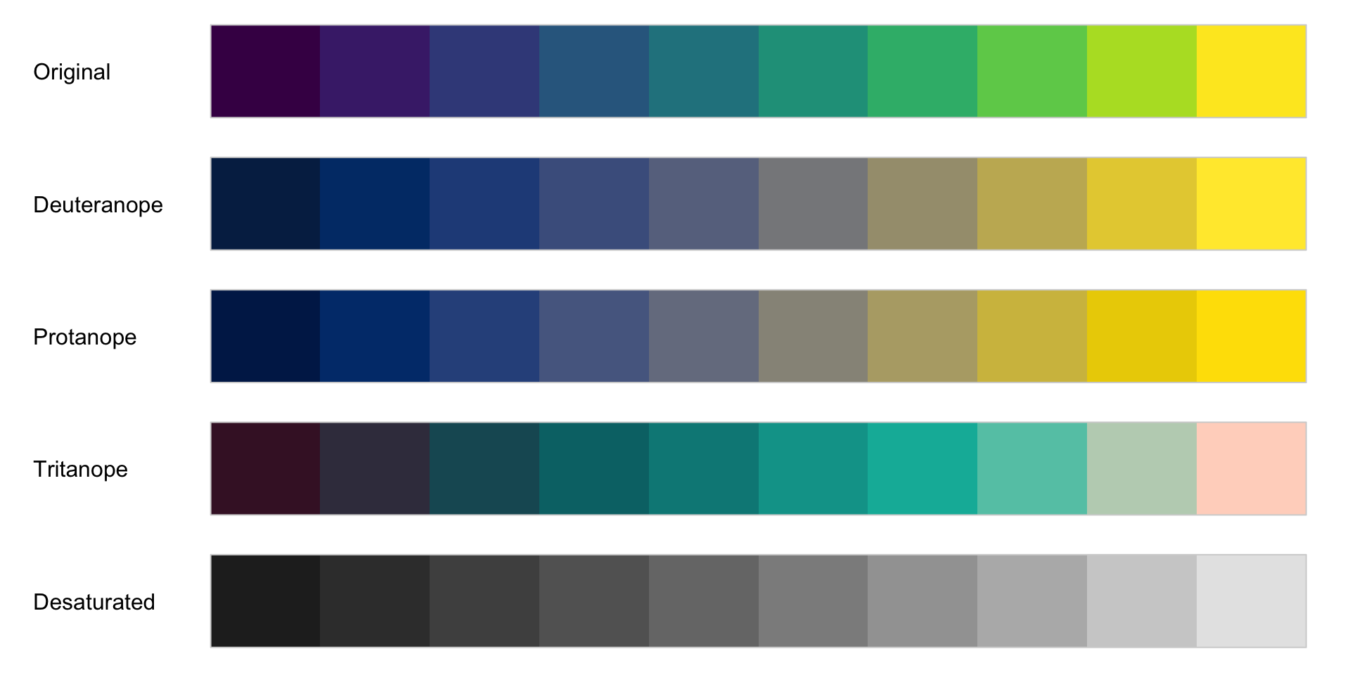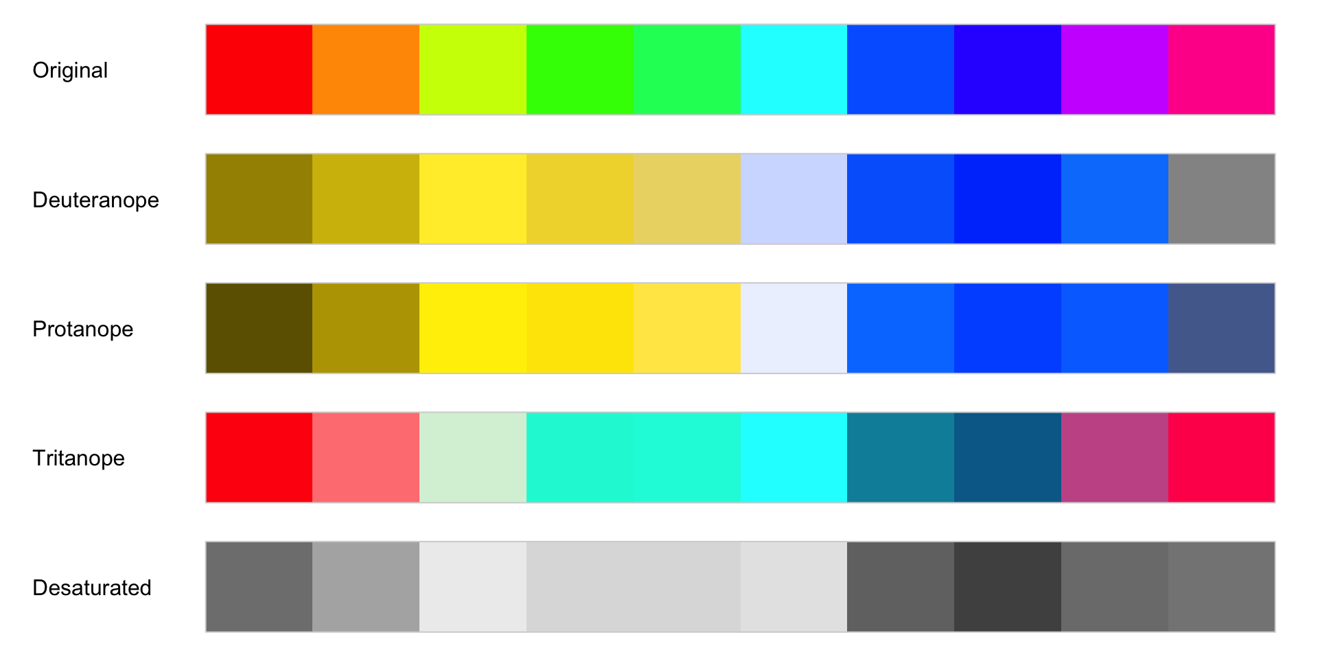 The rainbow color palette is also not color blind-friendly because baseline color (blue) gets emphasized with deuteranopia and protanopia.