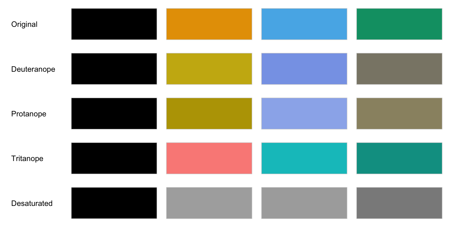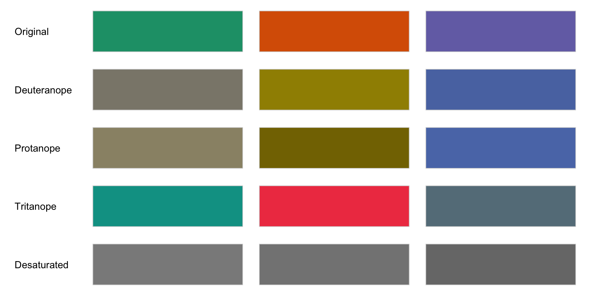 They are robust to colorblindness, so that the above properties hold true for people with common forms of colorblindness, as well as in grey scale printing.