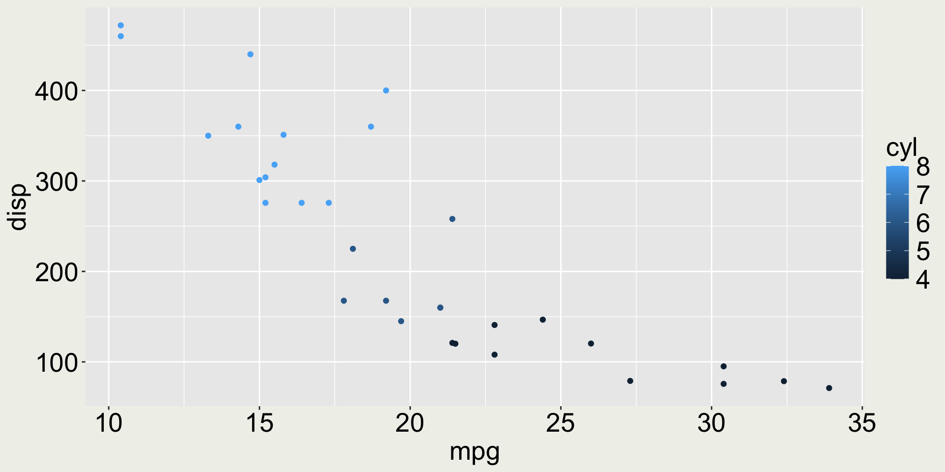 The variable cyl only has three values (4, 6, 8) but it is mapped to a continuous scale.