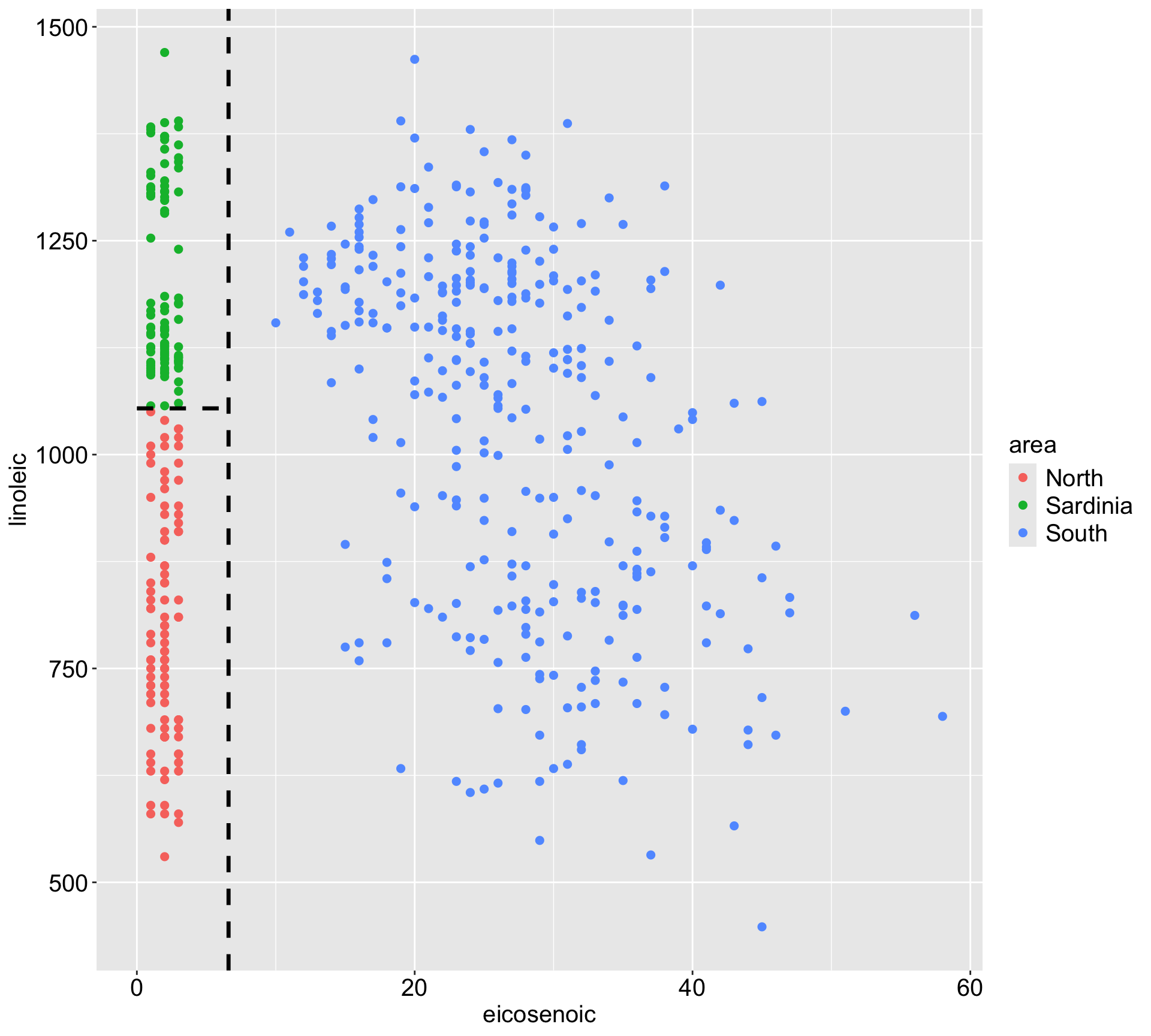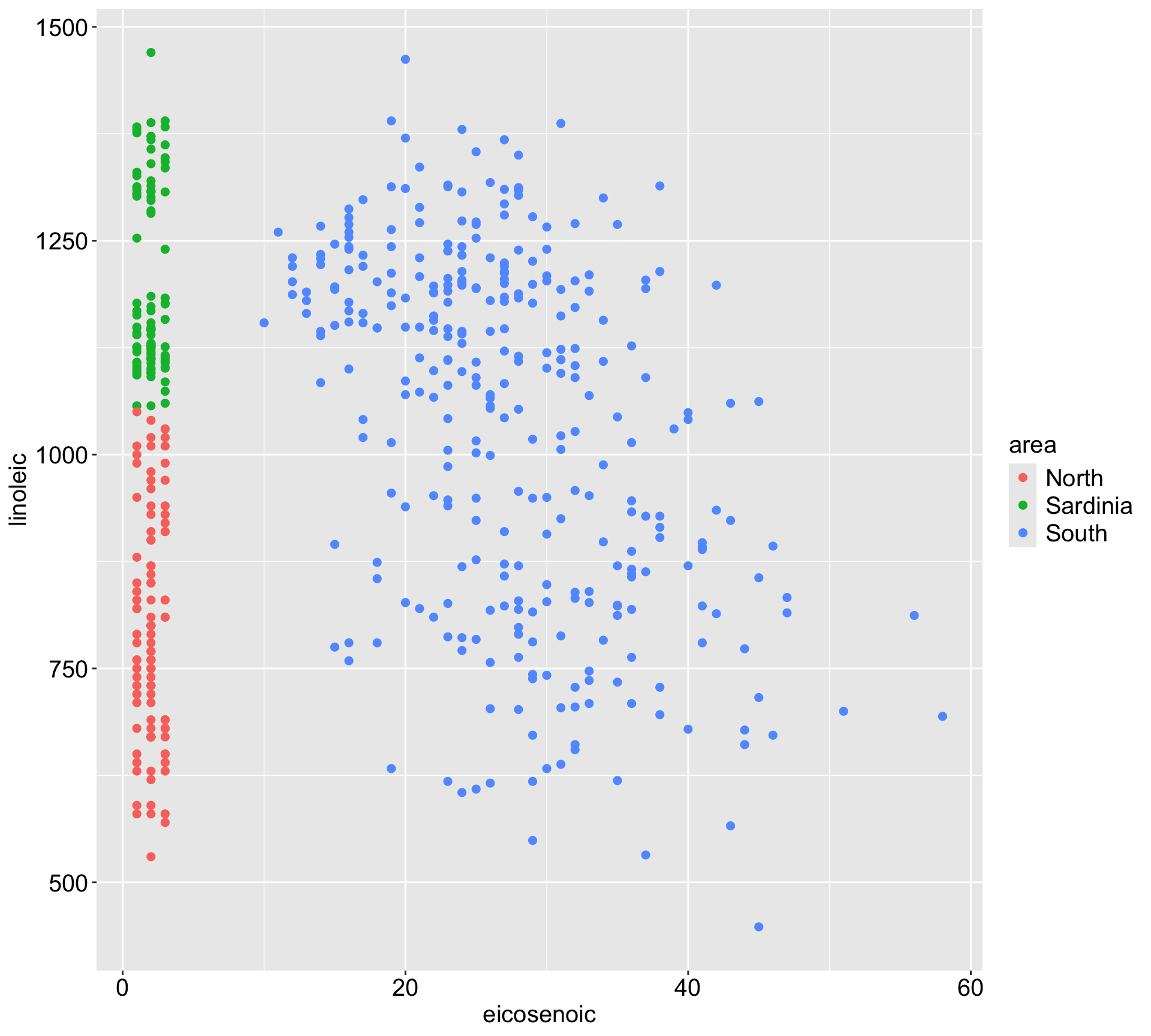 If we would like to predict the area from x1 (eicosenoic) and x2 (linoleic), would you expect linear regression or KNN to perform well?