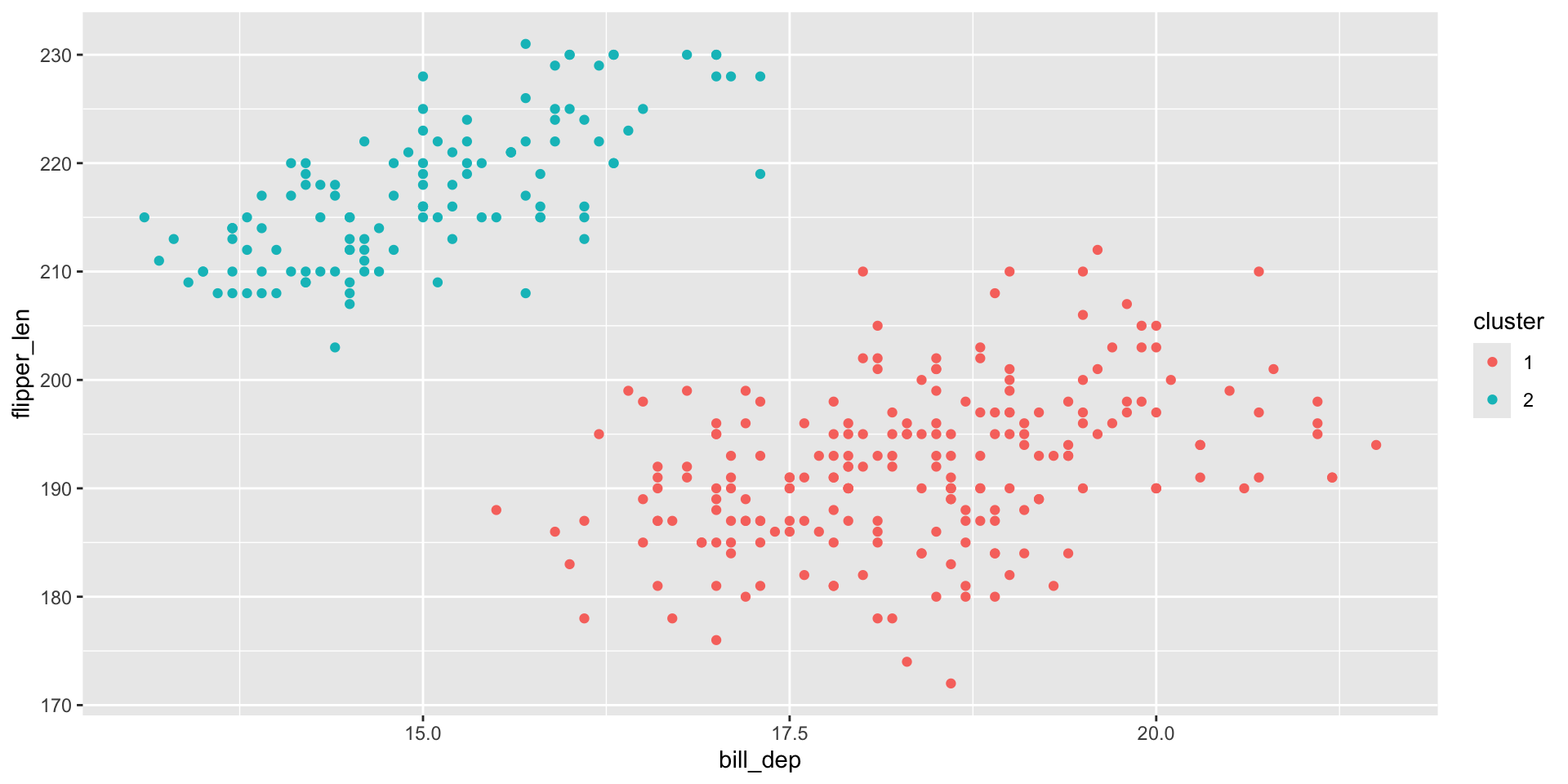dt |>ggplot(aes(x = bill_dep, y = flipper_len, color = cluster)) +geom_point()