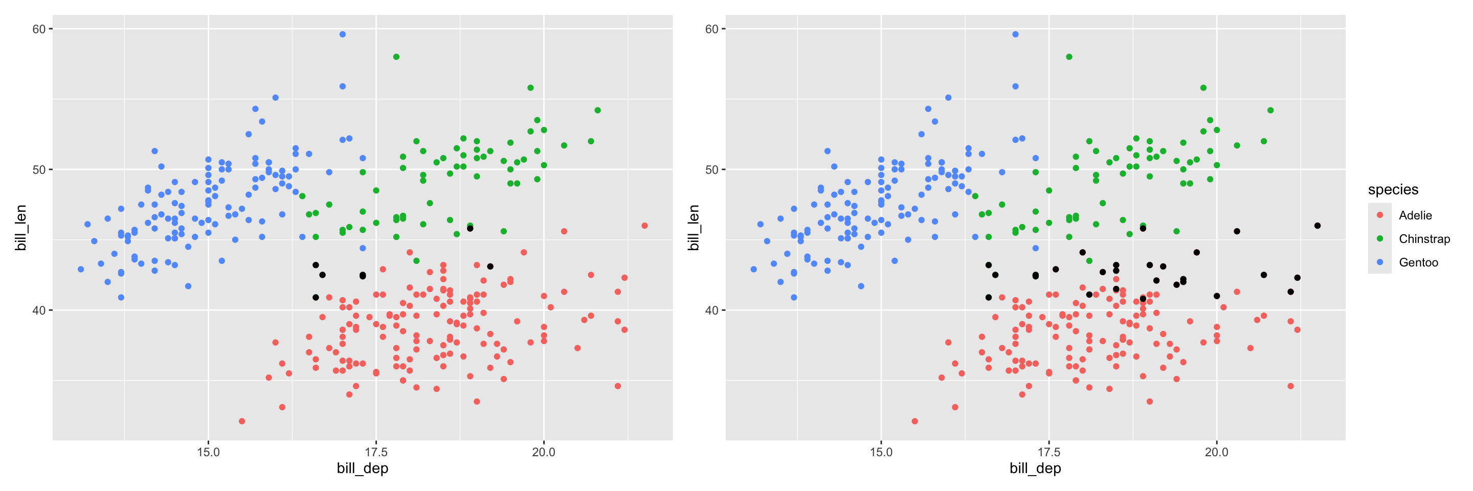 # cut the dendrogram to get 2 clustershclust_clusters <-cutree(hclust_results, k =2)dt <- penguins_clean |>mutate(cluster =as.factor(hclust_clusters)) dt |>count(cluster, species)