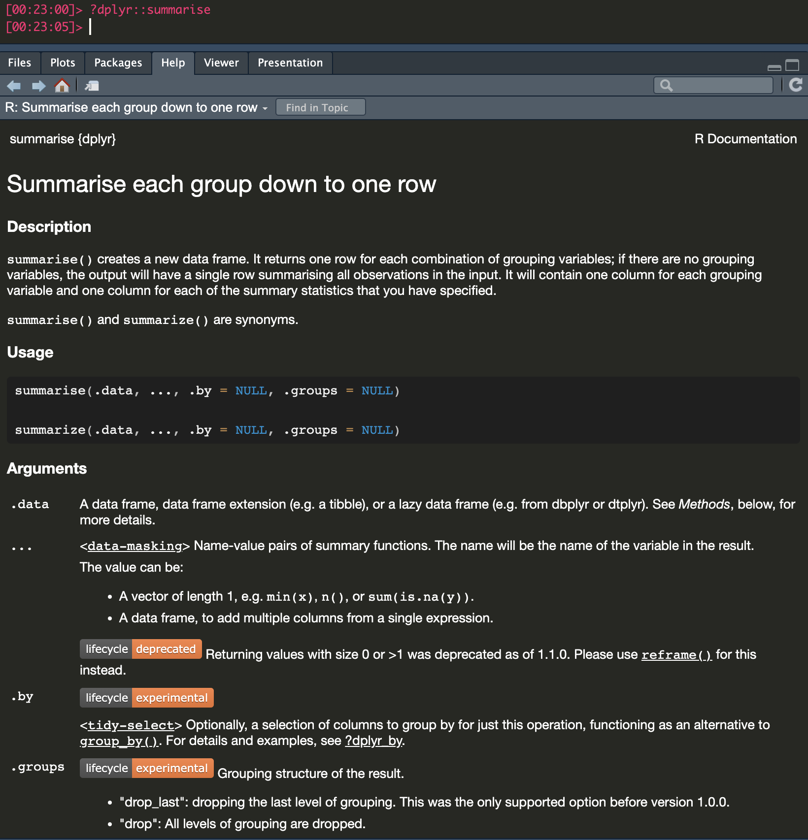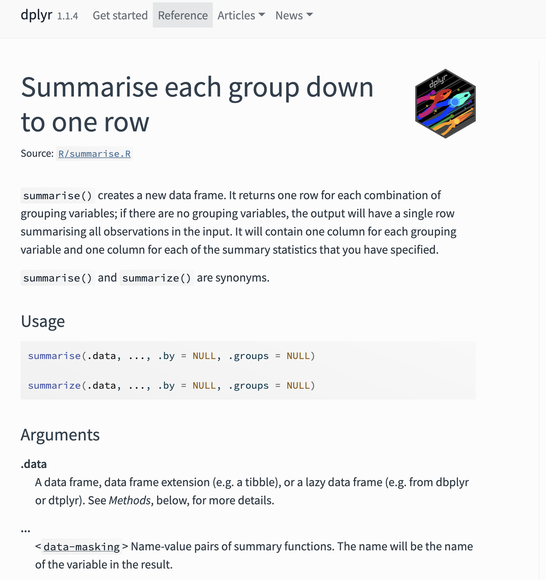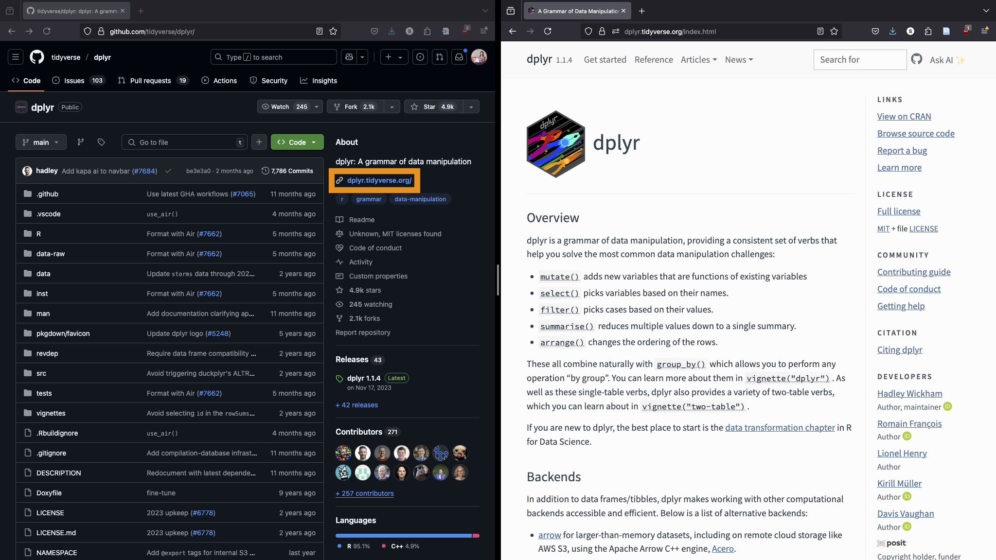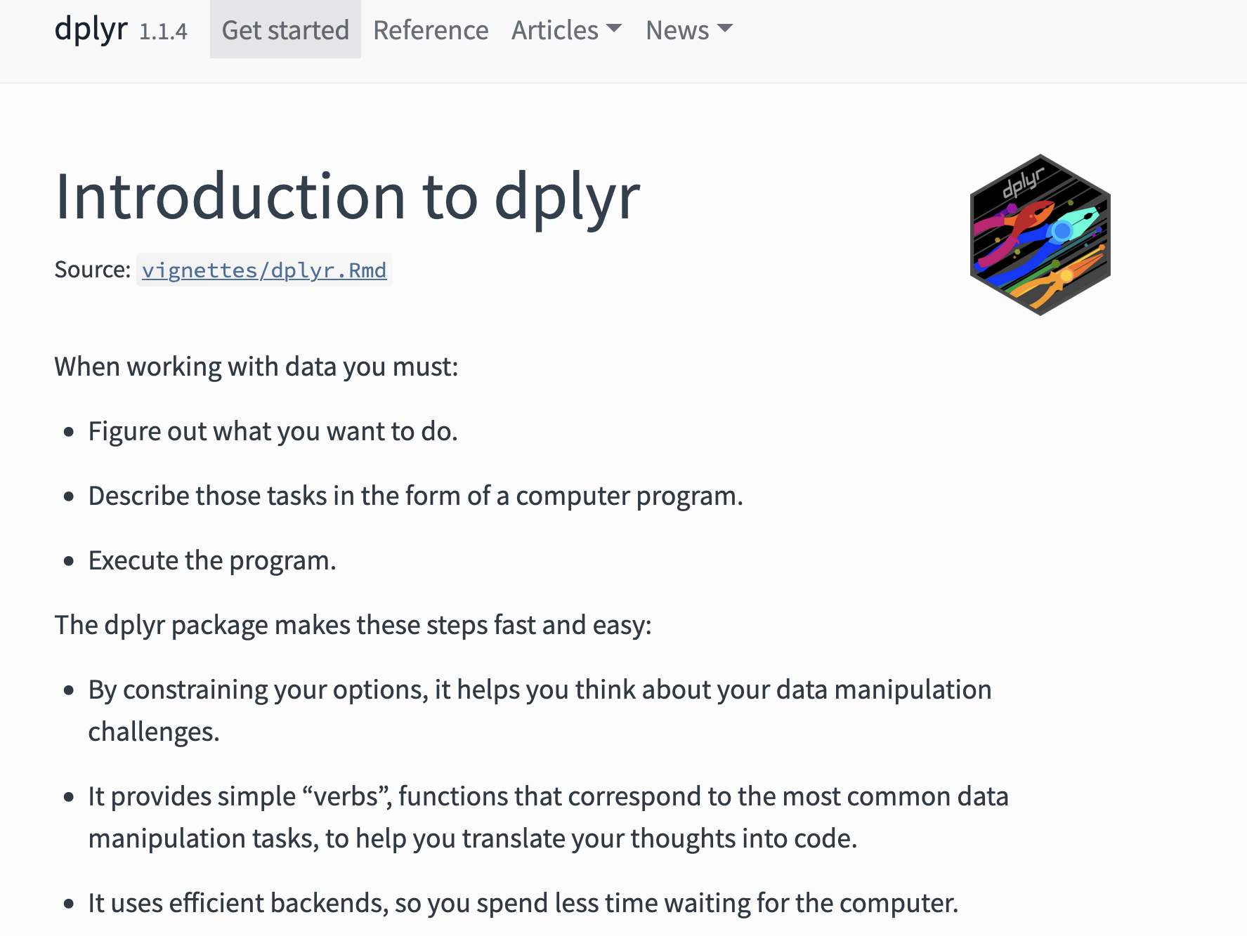 pkgdown site of a packageGo to https://github.com/tidyverse/dplyr and click the package link:
