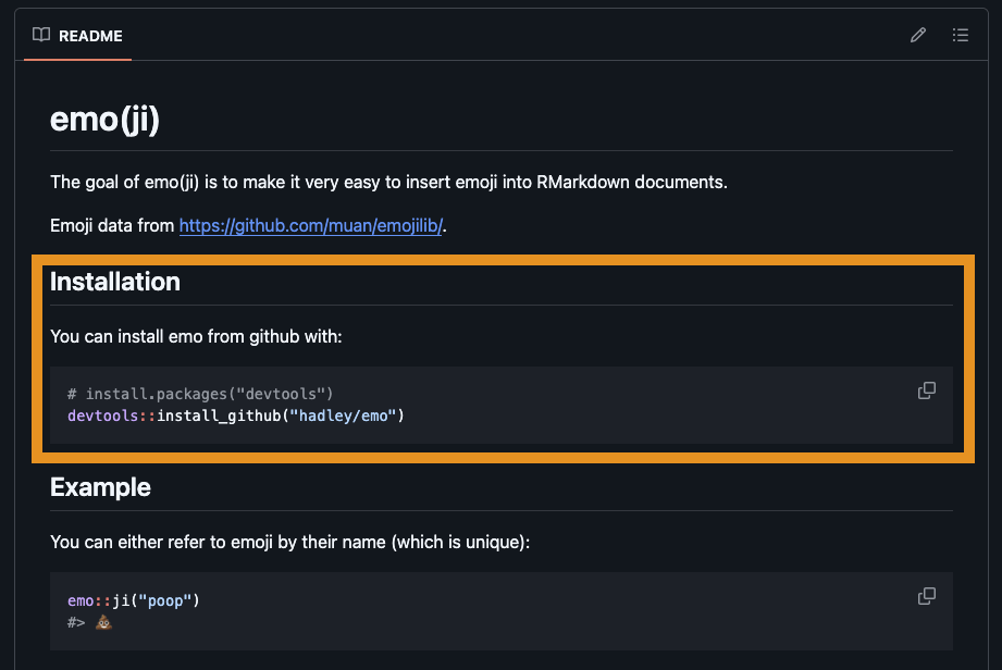 install.packages("tidyverse")library(tidyverse)(advance) Install and load the emo package from GitHub