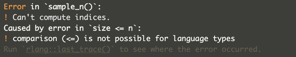 sample_n and find the proper argument name for the number of sample.sample_n()? What is the current recommendation? Can you see why?rename(): Rename columnsrename() syntaxDATA |> rename(NEW_NAME = OLD_NAME, ...)