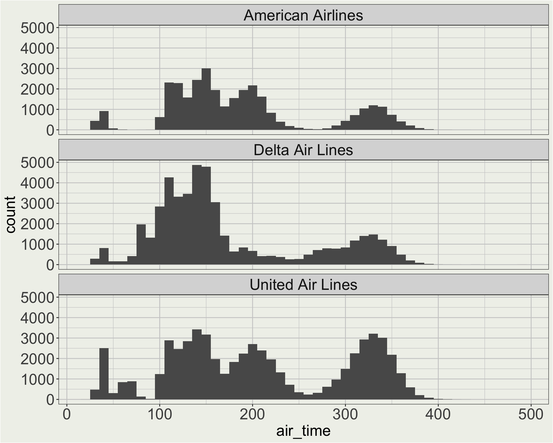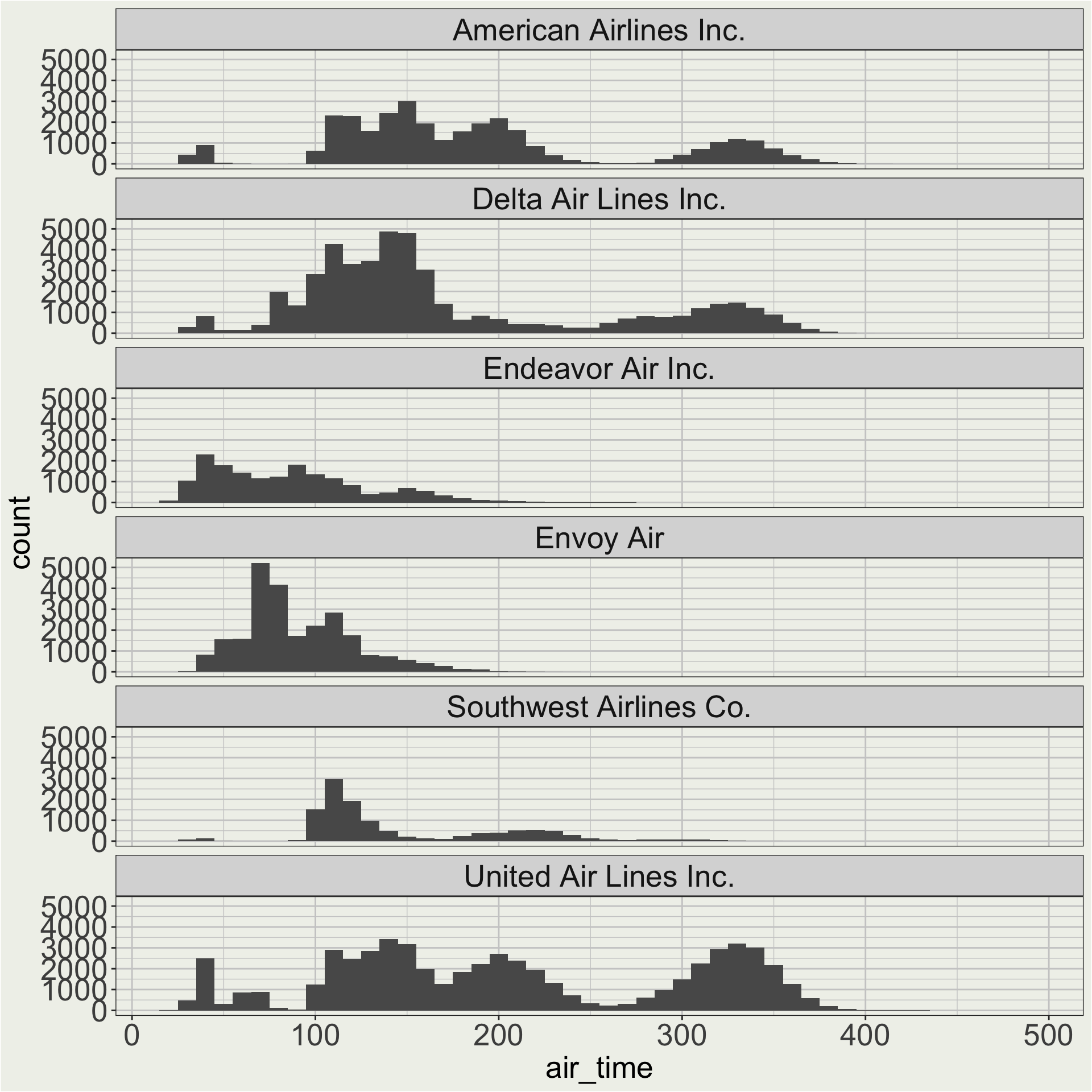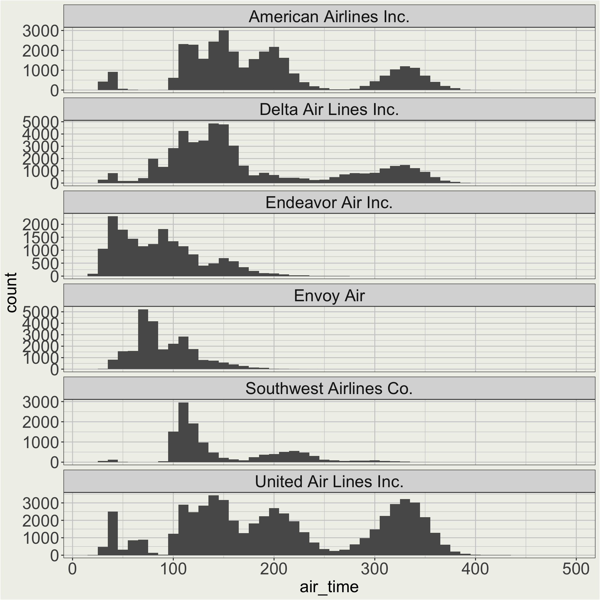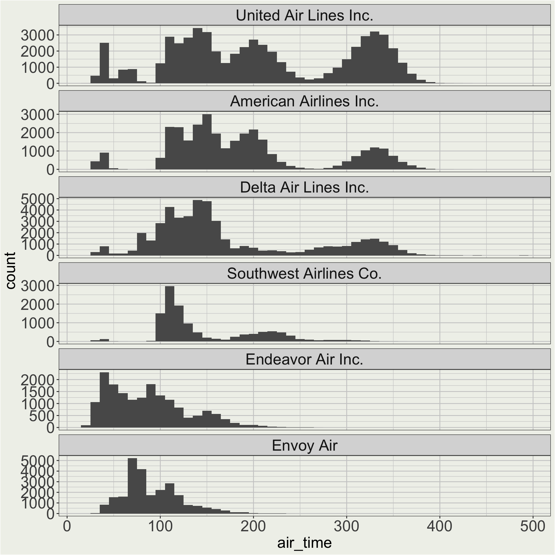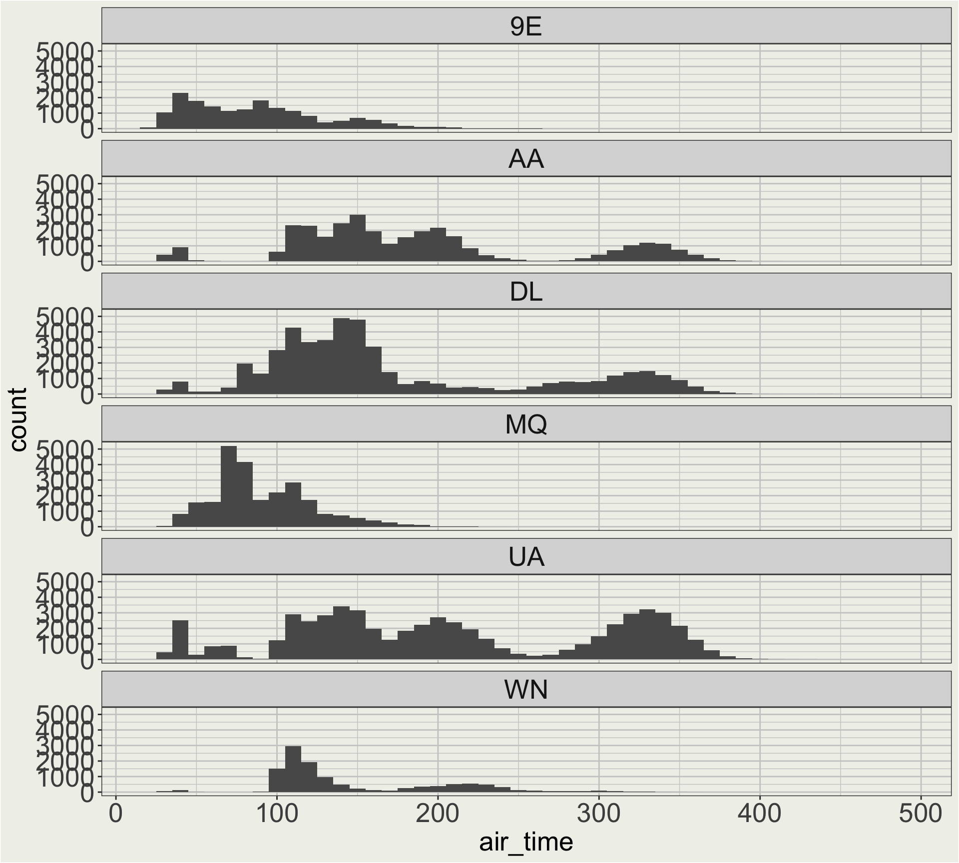 Here we care about the shape of the distribution of air time for each carrier, so maybe a free y scale is better.