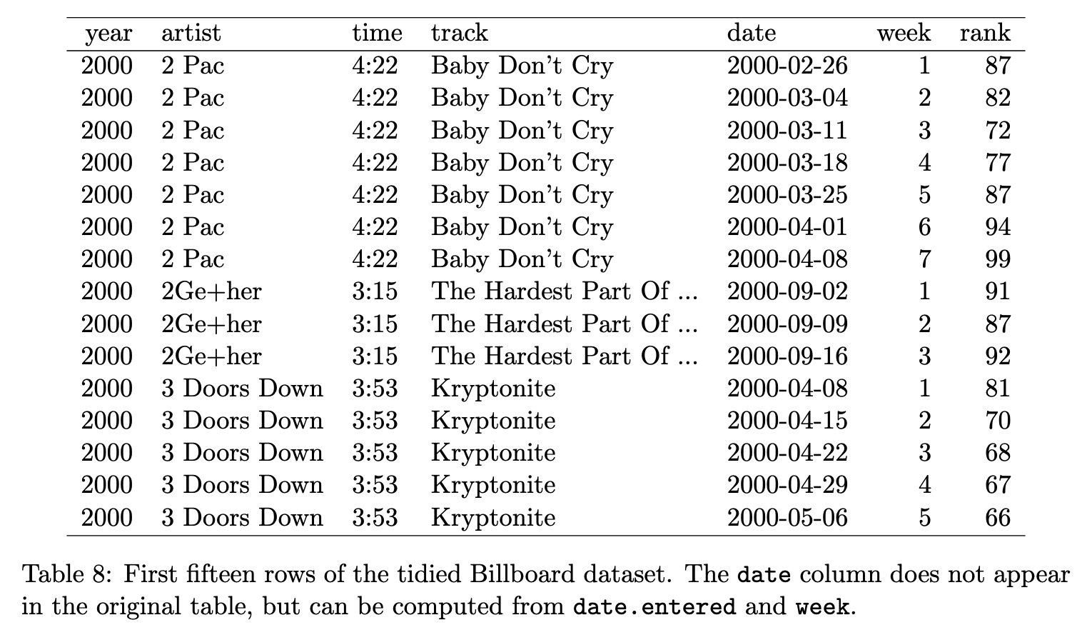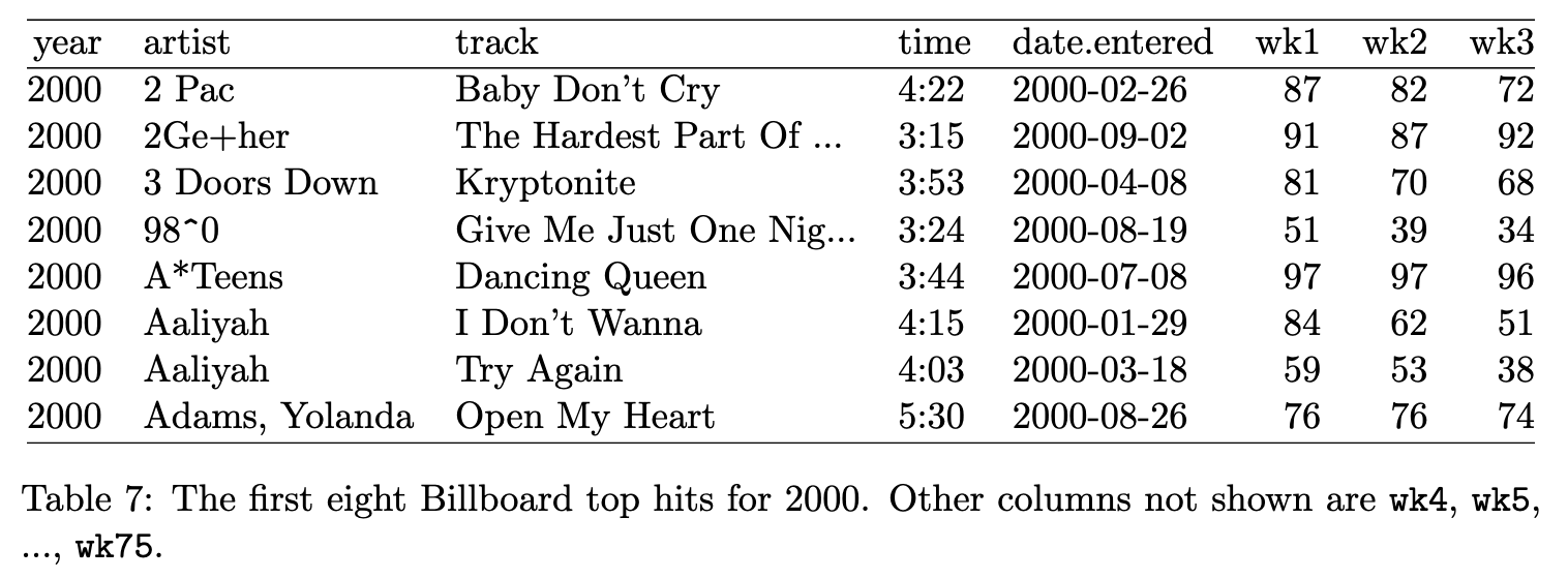✅ Yes, because 1) The variables are: year, artist, time, track, date, week, and rank, 2) The observation is a recorded rank of a song in a particular week