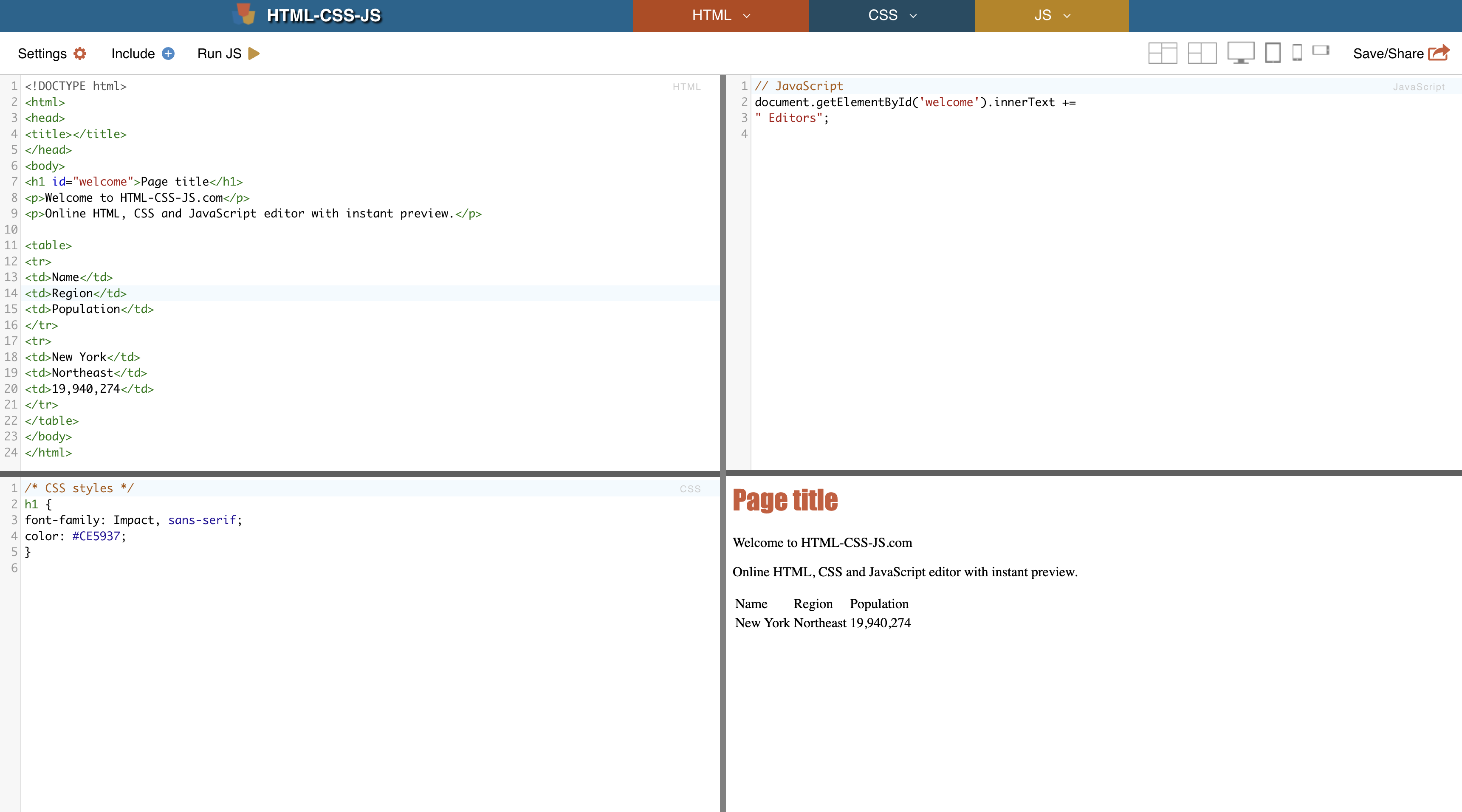 html <-minimal_html("<head><title></title></head><body><h1 id='welcome'>Page title</h1><p>Welcome to HTML-CSS-JS.com</p><p>Online HTML, CSS and JavaScript editor with instant preview.</p><table><tr><td>Name</td><td>Region</td><td>Population</td></tr><tr><td>New York</td><td>Northeast</td><td>19,940,274</td></tr></table></body>")html